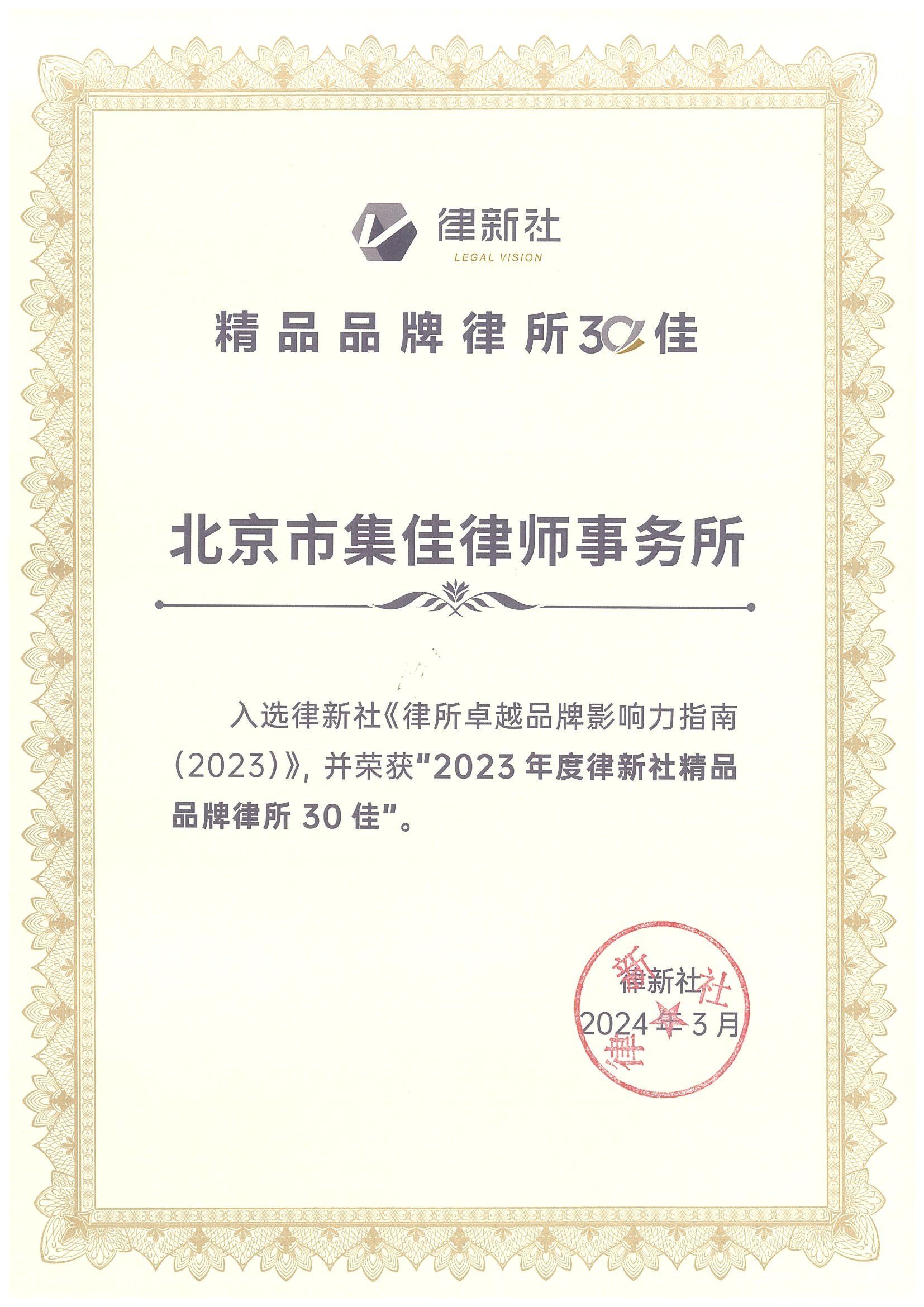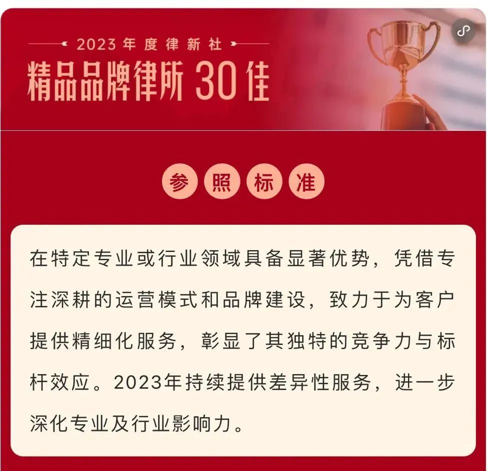 2024年3月2日,由中国法学交流基金会指导、律新社主办的“致·追光者”第二届法律服务业品牌发展论坛暨律新社2023年度品牌盛典隆重举行,现场发布了备受关注的《律所卓越品牌影响力指南(2023)》,欧博官网凭借在知识产权领域的卓越实力和良好口碑,荣登“2023年度律新社精品品牌律所30佳”榜单。