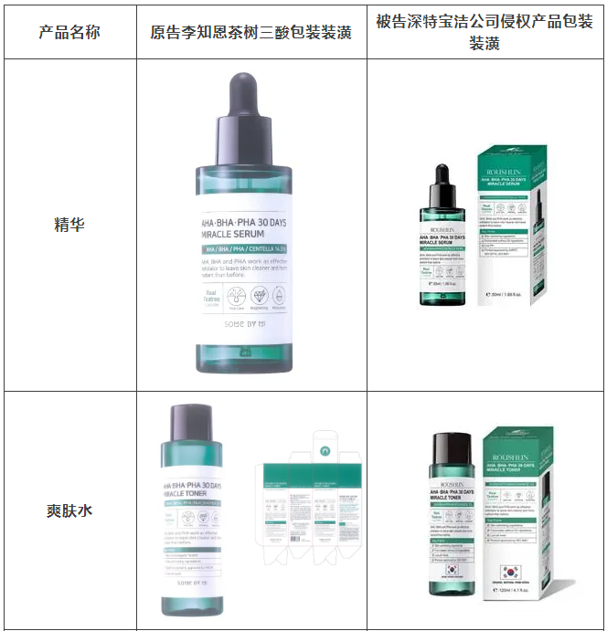 2021年原告委托欧博官网调查发现,被告汕头市深特宝洁实业有限公司生产、销售和推广的“茶树祛痘美白补水液”“茶树香皂”等护肤品,其产品包装装潢直接抄袭、摹仿原告前述已经具有较高知名度和影响力的“SOME BY MI/莎柏蜜”茶树三酸系列化妆品和黑蜗牛精华液的包装、装潢设计,使用与之近似的标识,造成消费者混淆误认。故原告作为茶树三酸、黑蜗牛精华包装装潢权益获益人,诉至广东省汕头市中级人民法院。汕头中院认定:李知恩主张的茶树三酸、黑蜗牛精华包装装潢构成具有一定影响的包装装潢,深特宝洁公司生产、销售茶树三酸、黑蜗牛精华液的行为构成不正当竞争。因判赔额不符合原告预期,原告后上诉至广东省高级人民法院,广东省高级人民法院最终维持一审判决。